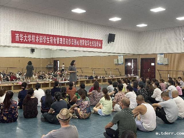 为深入贯彻高校工作“三全育人”的工作要求,积极落实以学生为中心,为师生服好务的工作宗旨,切实提高宿管中心员工的工作水平。7月7日上午,学校心理健康教育中心组织刘英华老师、杨科老师为学生宿舍管理人员开展了一次学生宿舍管理员初步识别心理异常学生的技能培训,心理健康教育中心主任王强主持培训活动。